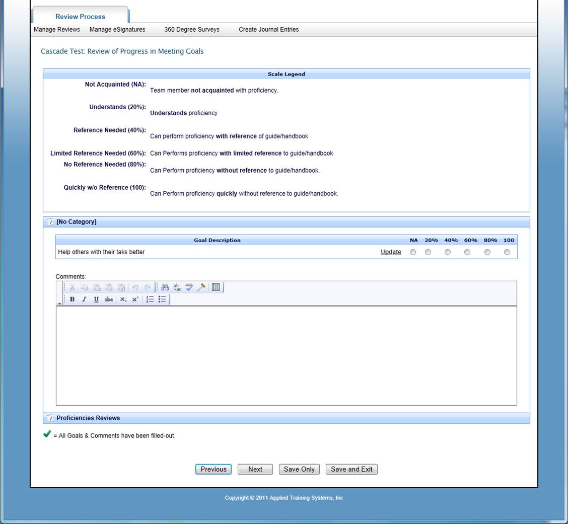 12. On the “Review Progress of Goal” section, make sure to click on “Proficiency Review” section at the bottom of the screen to expand this section. If every spot is not filled in, the form will not let you proceed. Make sure to write something in each “Comments Section”.